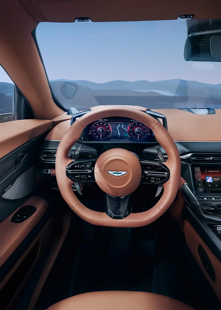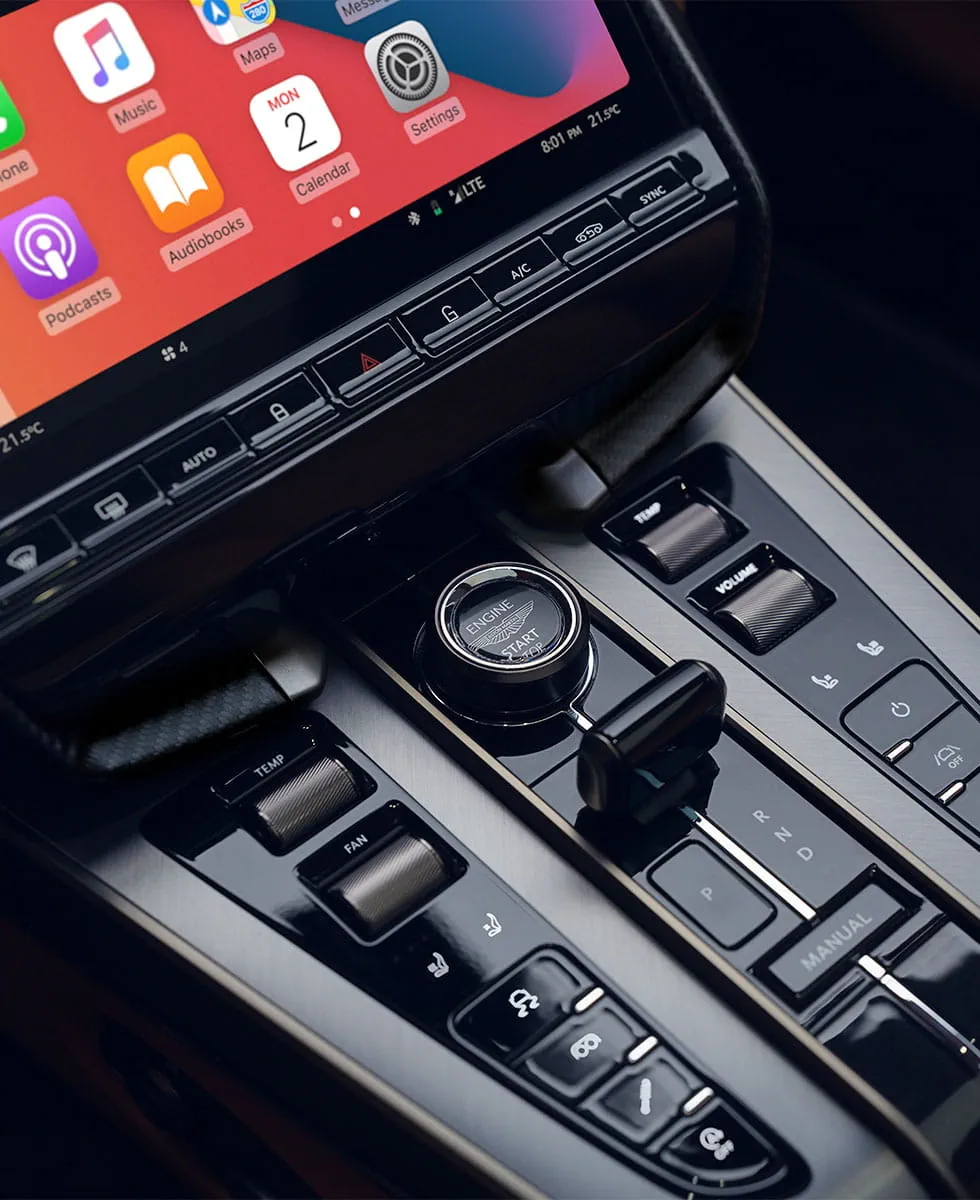 The new centre console features a unique, inch-perfect design that exudes high performance. The most called upon intuitive settings are managed by analogue rotary dials and switches. These haptic controls are perfectly blended with a state-of-the-art 'Pure Black' touchscreen. Bespoke to Aston Martin, this system is the best in its class.